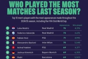 1、莫德里奇(皇马):76场,4376分钟
