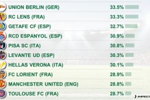 体育资讯11月4日讯 CIES统计了本赛季五大联赛球队攻防转换阶段占据进攻总时间的比例,并列出榜单,柏林联合由守转攻占比33.5%居首,朗斯33.3%、赫塔费32.7%二三位。